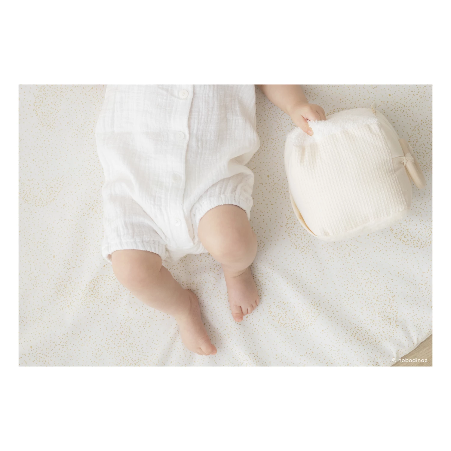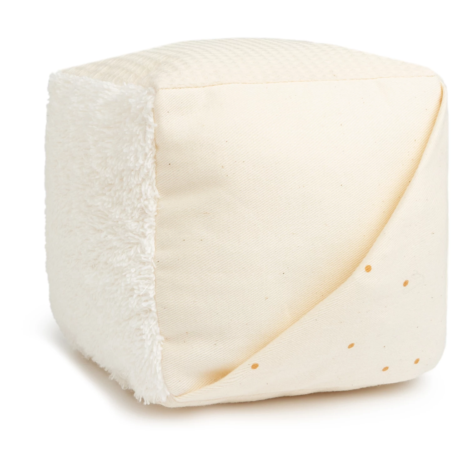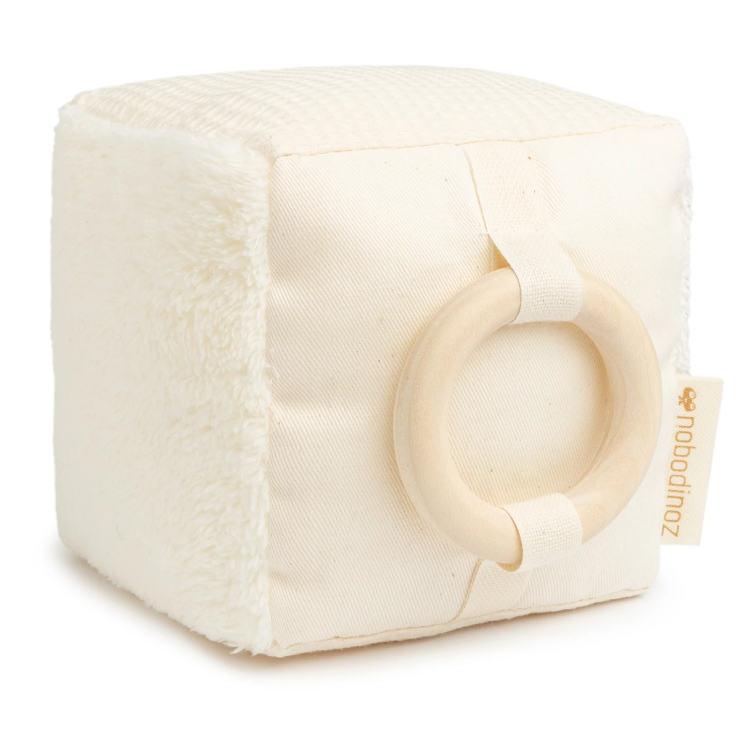 - This sensory early learning activity cube brings together all the soft Nobodinoz textures: poplin, twill, honeycomb, faux fur, terrycloth. It’s easy to handle for babies and it also has a crackling paper pocket and rattle, which will stimulate baby’s sense of hearing, as well as a solid maple wood ring.